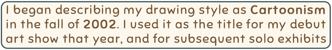 I began describing my drawing style as Cartoonism in the fall of 2002. I used it as the title for my debut art show, and for subsequent solo exhibits.