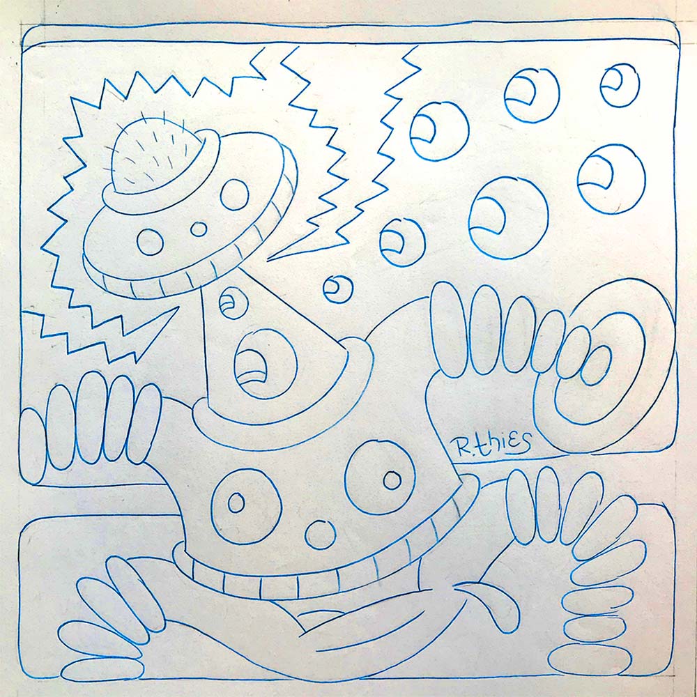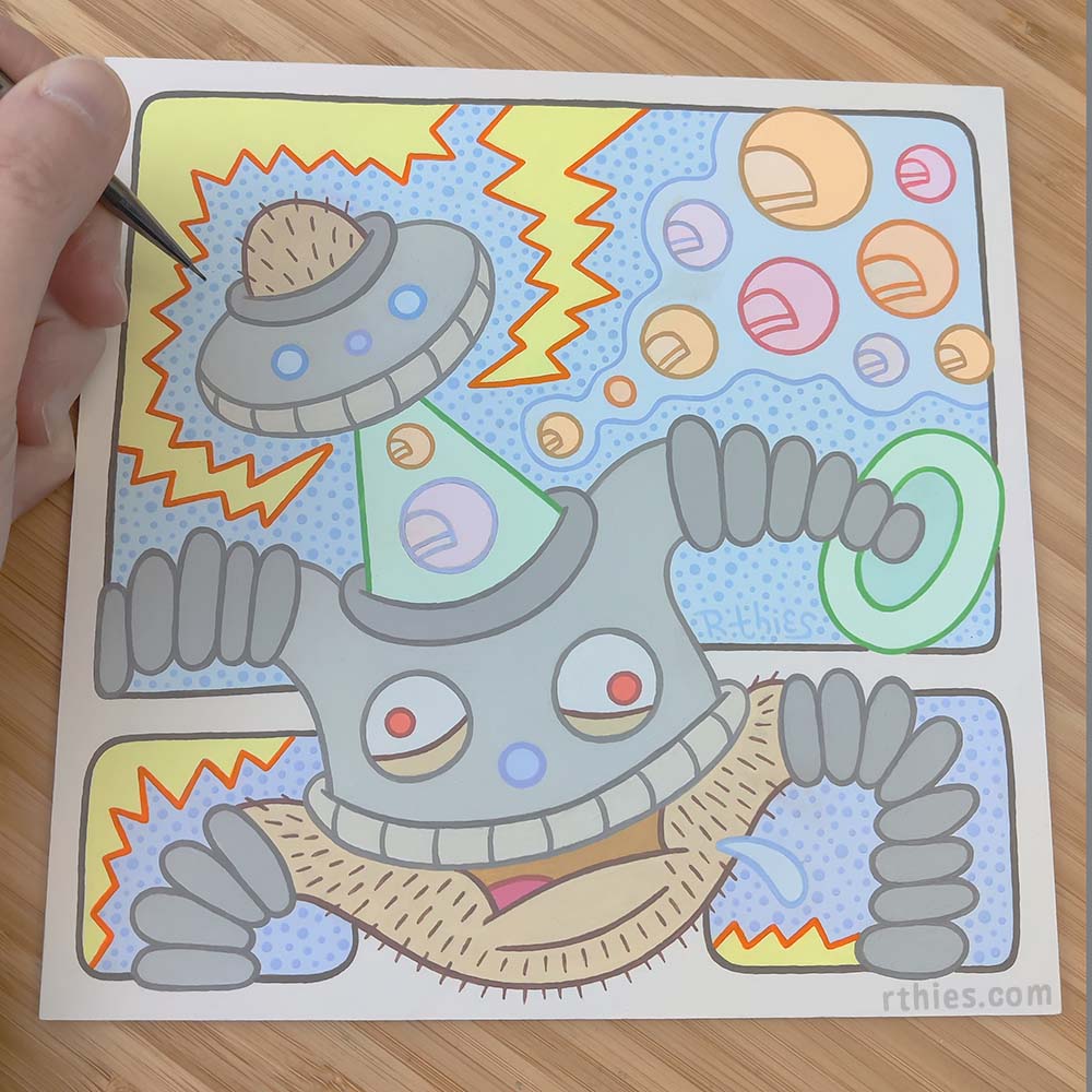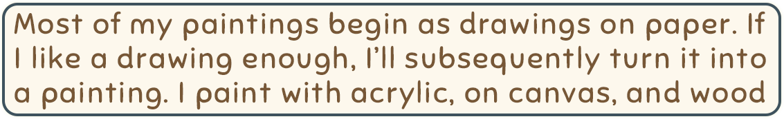 Most of my paintings begin as drawings on paper. If I like a drawing enough, I'll turn it into a painting. I paint with acrylic, on canvas, and wood.